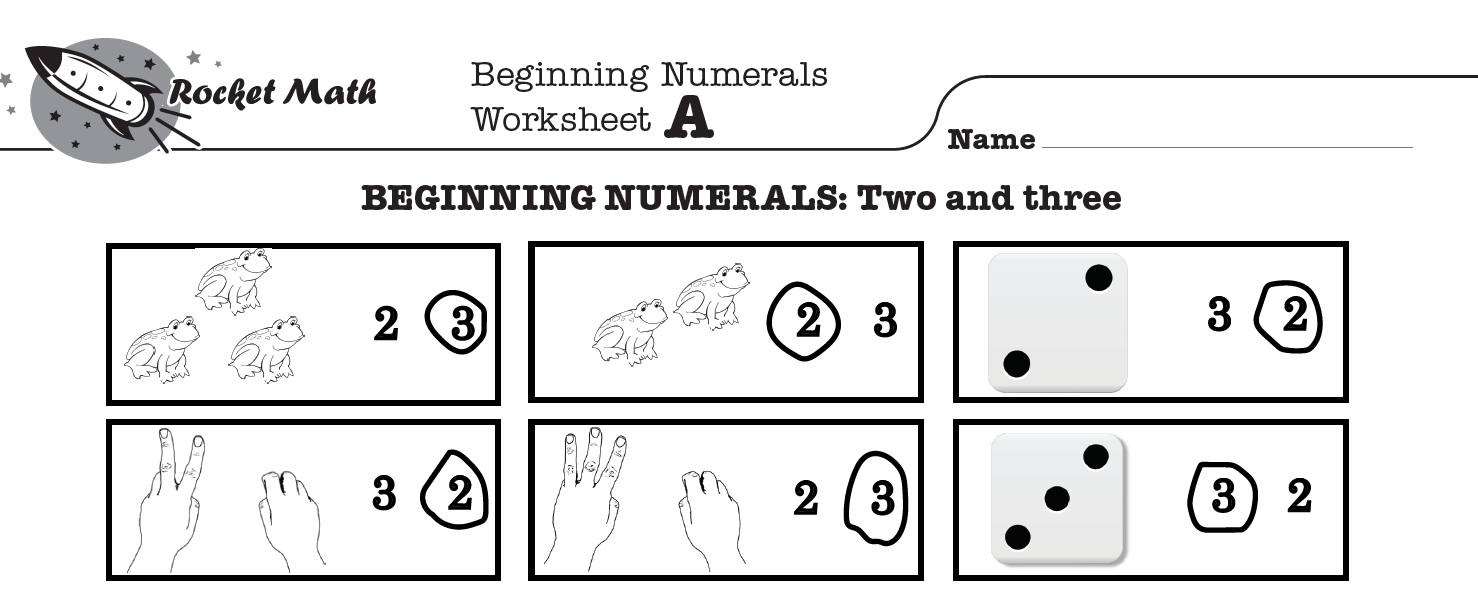 Each worksheet begins with a demonstration of counting objects and circling the numeral that matches. On worksheet A there are two and three only to learn. The teacher demonstrates (best with a document camera so all students can see) how she counts the objects and then points out that the answer is circled.