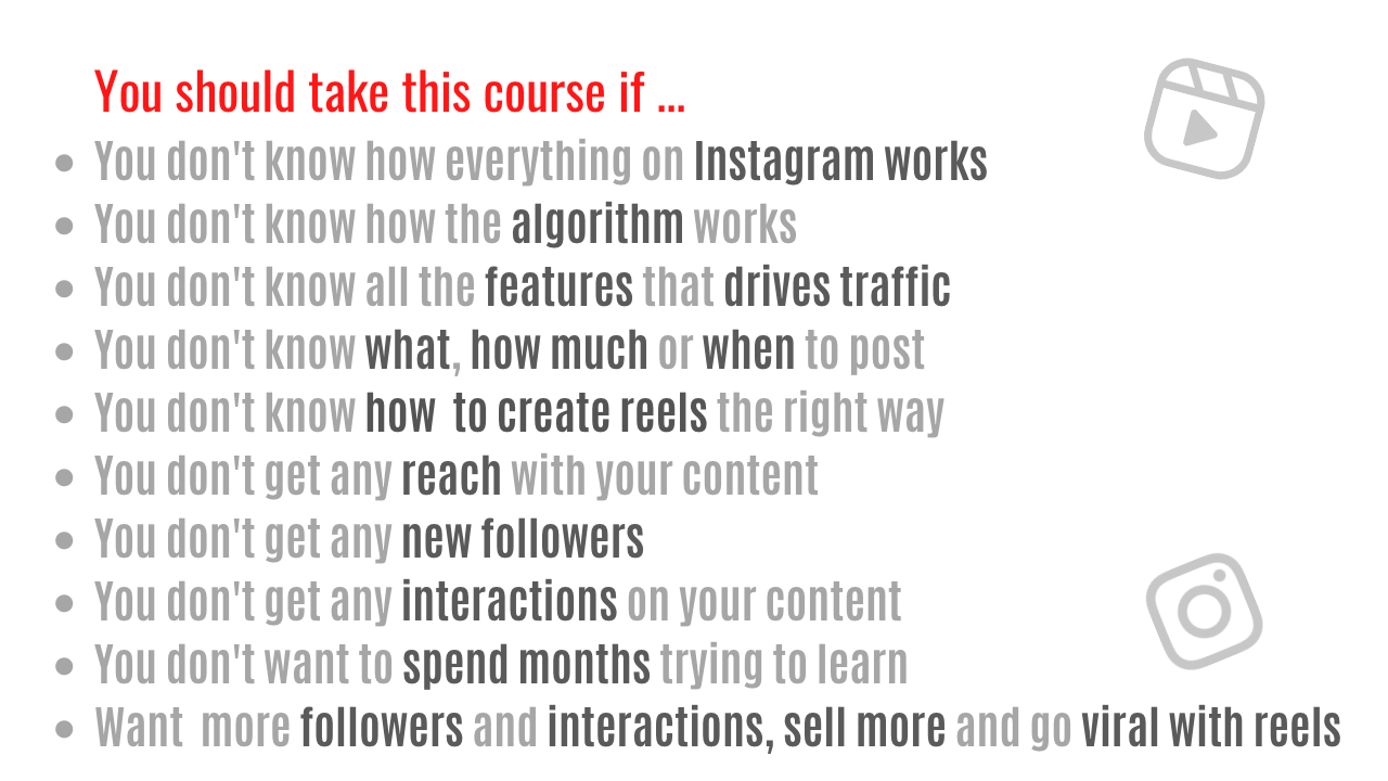 You will learn what the algorithm is and how the algorithm works. What is most important when we post content and how you can make Instagram push your content the most. How to create content and what you need to think about when it comes to content creation. What Hook - Story - Call to Action is and how to use it. When to post and how much you should post every week for Instagram to push your content the most. What you should do after you have posted something. And a lot more.