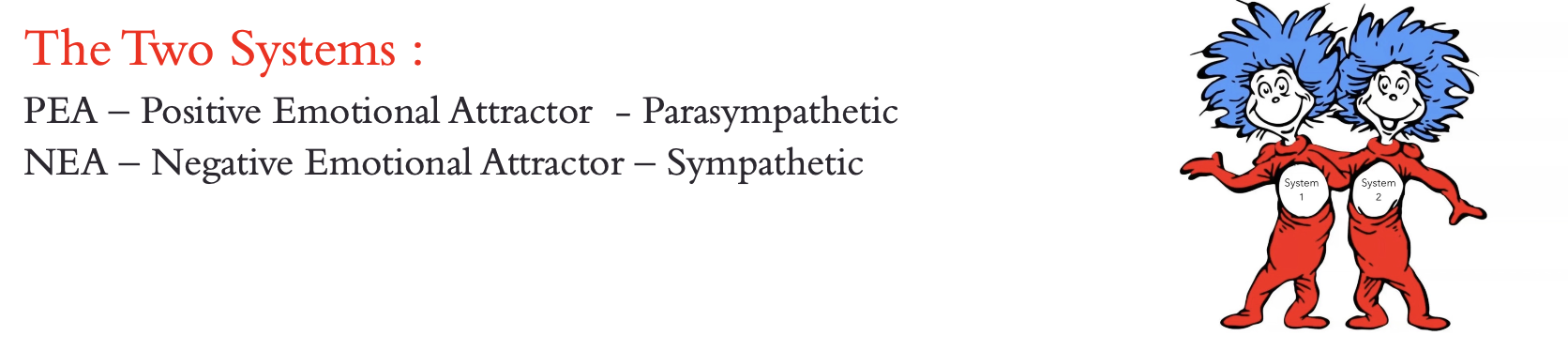 2: If we are in the NEA – we become cognitively impaired – and close down (peripheral perception goes down to 30 percent – focused on limited thinking, we don’t focus on anything else around us, cognitively, we know we are impaired we are not functioning - we are making a change through compliance – filled with resistance and negative chemicals and emotions. It is in fact, the only internal system we can control, and we do it with our breath.
