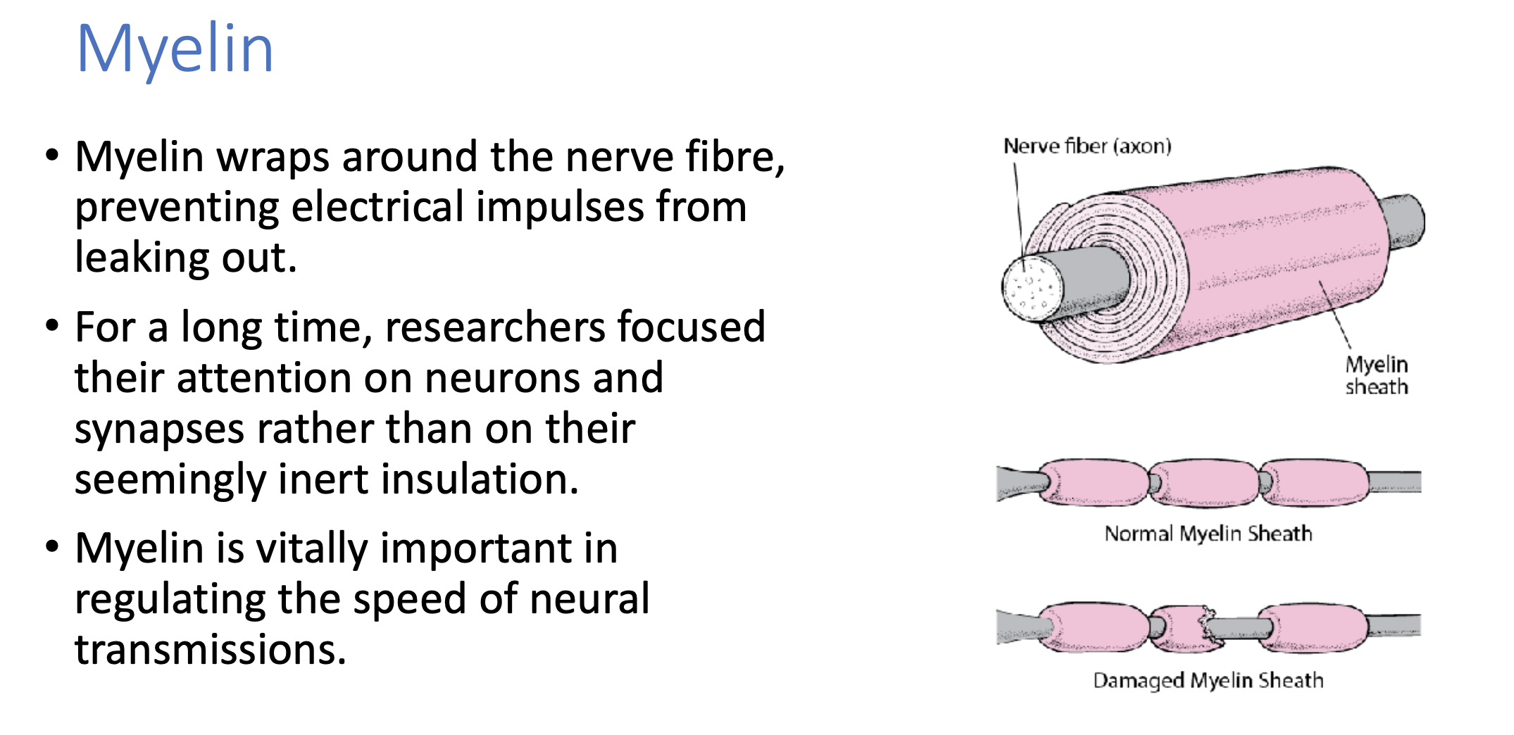 A recent discovery around the – previously it was considered as “nothing special” until scientists discovered the thickness and the strength of myelin is what acts as an “insulator” to the AXON, and that is what lets information travel along the AXON at much greater speeds… (think memory recall access to information)