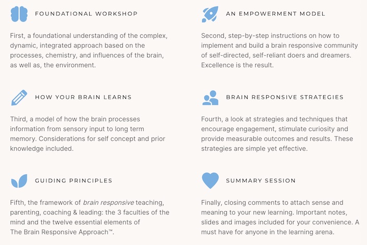 The Brain Responsive Approach™ leads to self-directed, self-reliant doers and dreamers! Now your job is easy and much more fun! The course is designed to motivate and engage individuals; the parent, teacher, coach, leader and learner to understand the learning process, apply and master the most effective strategies to increase memory and skills while in the learning process and pursue excellence at all times. The course addresses a framework that promotes empowerment - creating conditions in which one can act on their own behalf. A 6-week comprehensive immersion program teaching the knowledge, skills and strategies of The Brain Responsive Approach™ to teaching, parenting, coaching, leading and learning.