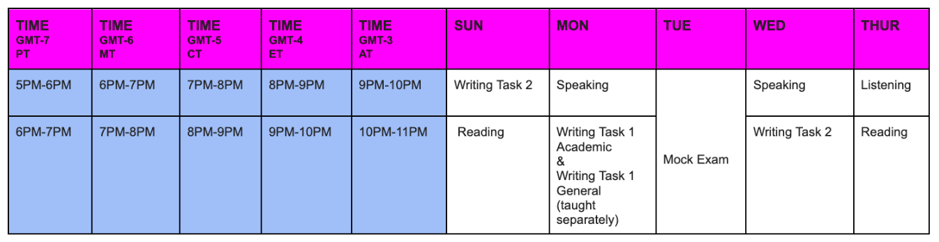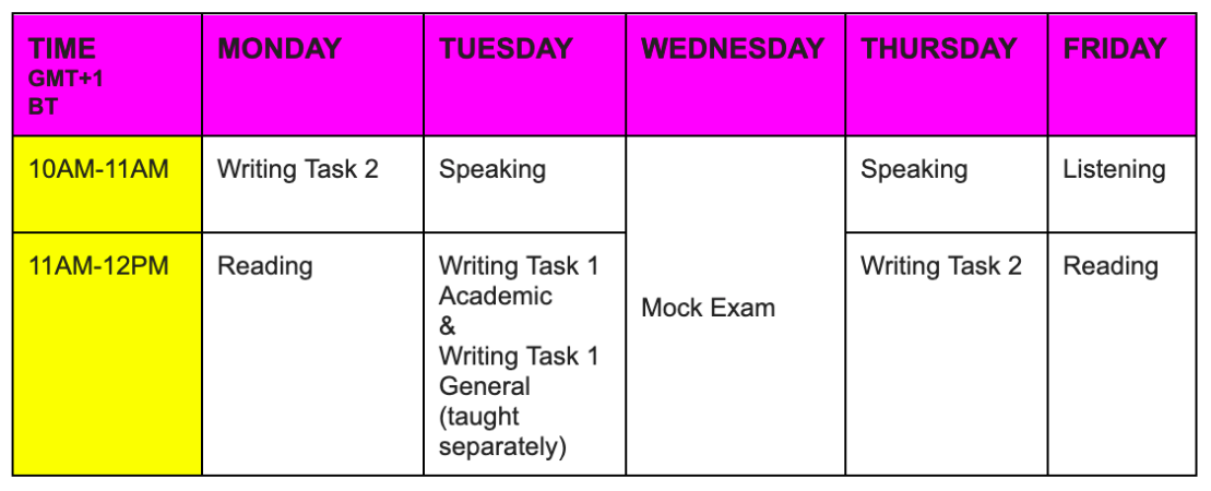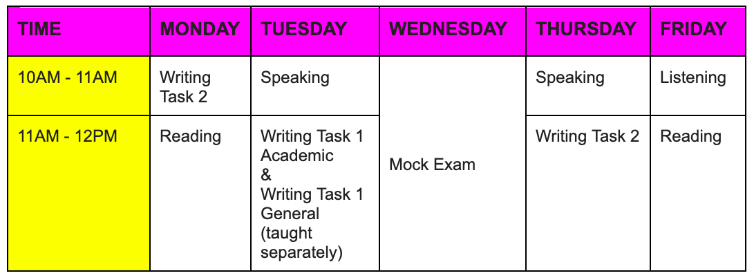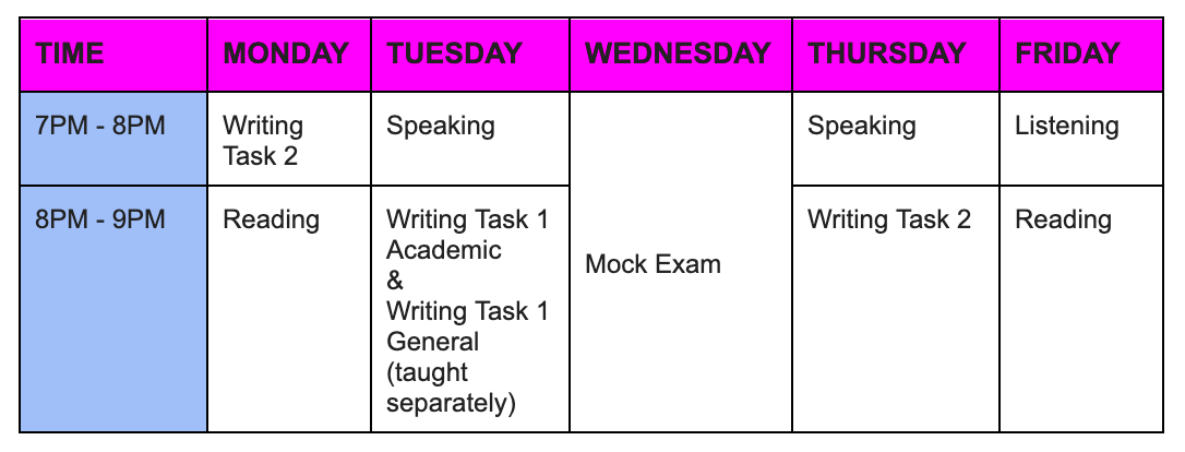 *Students can start any day of the week. *Mock Exams on Wednesdays (without a teacher): Answers are provided and questions will be entertained by your teacher in the Thursday and Friday classes