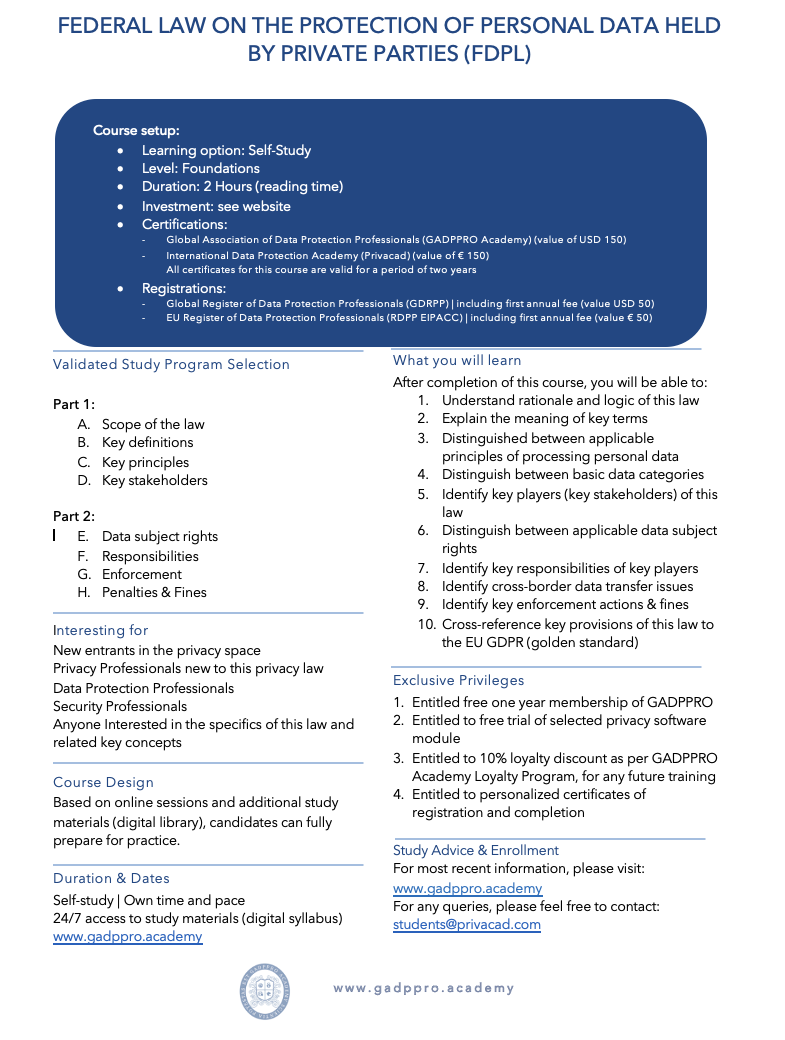 After passing the national privacy law exam, candidates will be issued a GADPPRO Academy Certificate of Completion (CoC) plus a Certificate of Registration (CoR) in the EU Register of Data Protection Professionals (EU-RDPP).