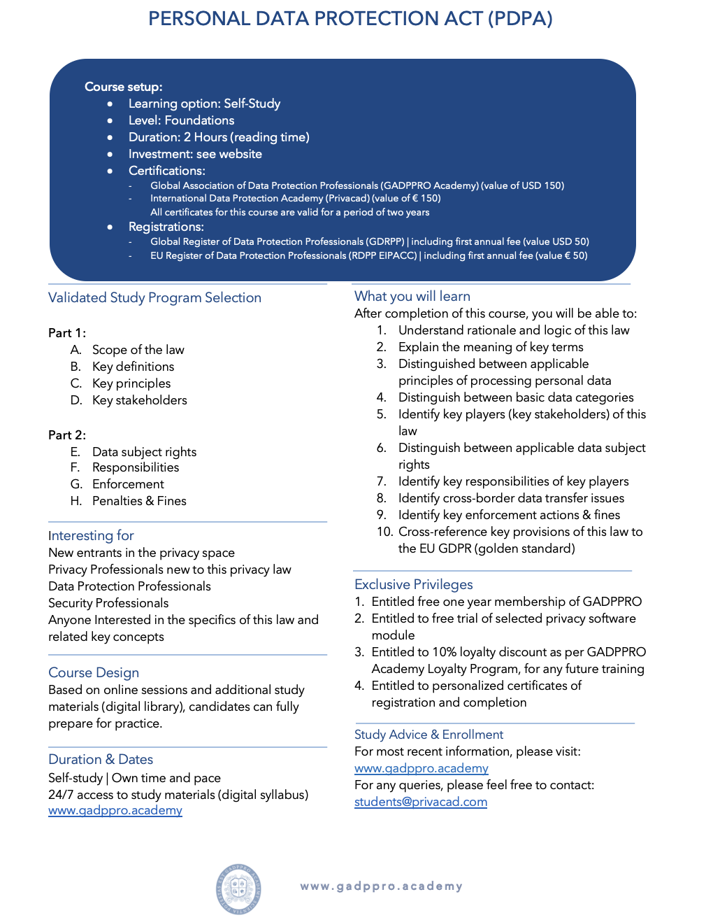 After passing the national privacy law exam, candidates will be issued a GADPPRO Academy Certificate of Completion (CoC) plus a Certificate of Registration (CoR) in the EU Register of Data Protection Professionals (EU-RDPP)